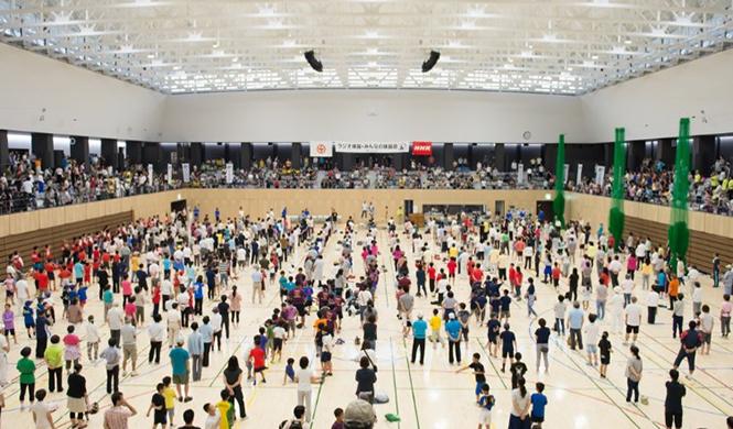 7月21日(木)に千葉県の流山市民総合体育館(キッコーマンアリーナ)において「夏期巡回ラジオ体操・みんなの体操会」を開催しました。流山市は千葉県北西部の東葛地域に位置する市で、人口は約17万人。旧葛飾郡で、明治初期には葛飾県庁が置かれました。「都心から一番近い森の街」をキャッチフレーズに掲げる緑豊かな落ち着いた住宅都市です。