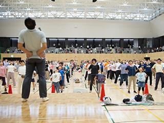 雨のため、雨天会場の流山市民総合体育館(キッコーマンアリーナ)での開催となりました。今年4月に完成したばかりの体育館を2階まで開放して約2100名の参加者が集まりました。講師の多胡先生の声が響く中、準備運動が始まりました。