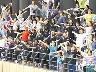 夏休みに入った学校が多く、クラブ活動の生徒たちも多く見受けられ、2階の観覧席で参加する方は、お互いにぶつからないよう工夫し合いながら、ラジオ体操を行いました。