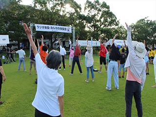 7月26日(火)に鹿児島県の大崎町ふれあいの里公園多目的広場において「夏期巡回ラジオ体操・みんなの体操会」を開催しました。大崎町は人口およそ1万4千人。今年で町制施行80周年を迎える伝統ある町で、志布志湾の多様な水産物や、広大な大地が育む豊かな農畜産物など、食材の宝庫です。