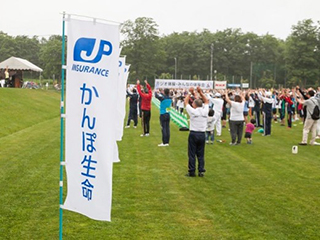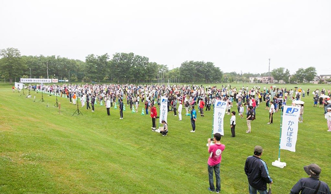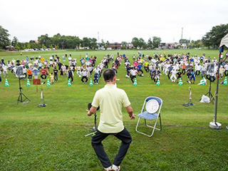 8月1日(月)に北海道江別市の飛鳥山公園多目的市民広場において「夏期巡回ラジオ体操・みんなの体操会」を開催しました。江別市は、札幌市の隣に位置する人口およそ12万人のまちです。大学や研究機関が集積する文化都市である一方、市内には石狩川が流れ、世界に誇る2050ヘクタールの大自然に恵まれています。また、古くからレンガ製造が盛んで、「れんがのまち江別」としても知られています。