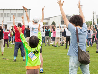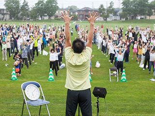 飛鳥山のなだらかな山麓に広がる広場に、ご高齢の方から小さなお子さんまで約1600名が集まり、準備運動が始まりました。参加者は、講師の多胡先生の覇気のある動きをまねて、きびきびと体を動かしていました。