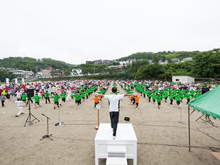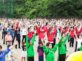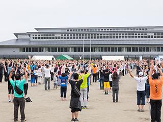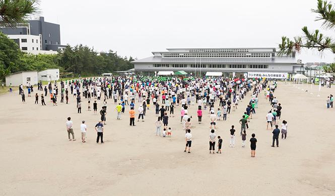 真新しい校舎に向かって整列し、講師の多胡先生の指導のもと準備運動が始まりました。その後、グラウンドには「ラジオ体操の歌」の元気な歌声が響き、体操服姿の中学生や近隣の方々など、様々な年代の方が、いきいきとラジオ体操を行いました。