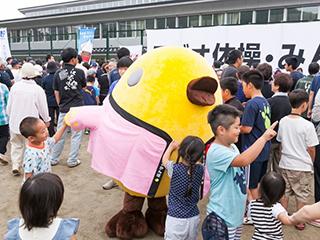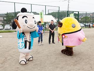 江差町のマスコットキャラクター「しげっち」と、かんぽ生命のキャラクター「ゆめぴよ」も来場し、子どもたちを出迎え、一緒にラジオ体操をして体操会を盛り上げました。体操会終了後は、ラジオ体操を終えた子どもたちが「しげっち」や「ゆめぴよ」に駆け寄り、楽しそうに触れ合う場面が見られました。