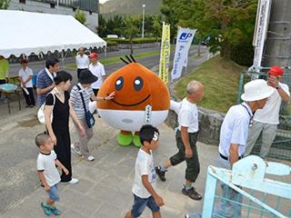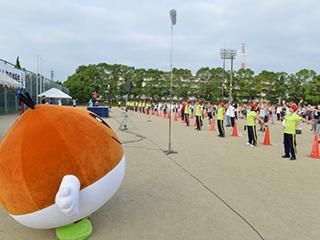 市制15周年記念の体操会を盛り上げるために駆け付けた、栗東市マスコットキャラクター「くりちゃん」が参加者を出迎え、約1000名の方が集まりました。