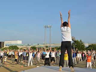 抜けるような青空の下、思いきり体を伸ばし、準備体操が始まりました。その後のラジオ体操では、講師の岡本先生の動きをまねて、一斉にのびのびと体操を行いました。引き続いて行われたポイントレッスンにも多くの方が参加され、岡本先生の丁寧な指導にあわせて一生懸命に体を動かしていました。