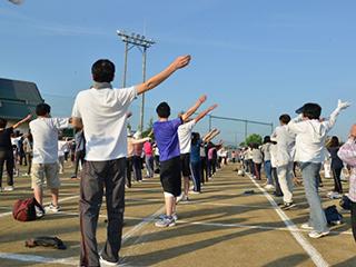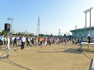 体操会終了後、参加者がラジオ体操の動作について岡本先生に熱心に質問する場面があり、ラジオ体操を日頃から生活に取り入れている方が多くいらっしゃる様子がうかがえました。町制30周年記念にふさわしく、安堵町の皆さんの元気が一気に集結したような活気ある体操会となりました。