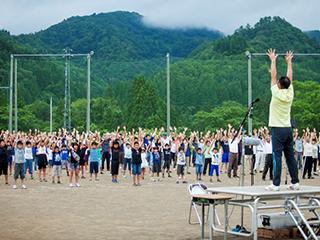 東成瀬村中学校創立70周年・統合40周年を記念して開催された体操会には、小中学校の生徒の皆さんや、そのご家族の方をはじめ、村民の方々約900名が参加しました。背後の山々に朝もやが立ち込める中、講師の多胡先生の指導のもと、準備運動の開始です。