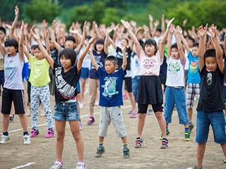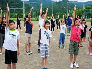 8月9日(火)に秋田県の東成瀬村多目的グラウンドにおいて「夏期巡回ラジオ体操・みんなの体操会」を開催しました。東成瀬村は、秋田県の東南端に位置する村です。奥羽山脈に抱かれ、栗駒山から流れる成瀬川にはイワナやヤマメが生息し、蛍が飛び交うなど、美しい自然が残されています。