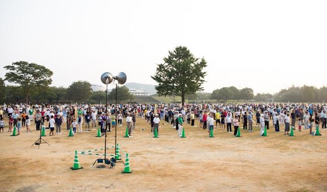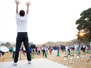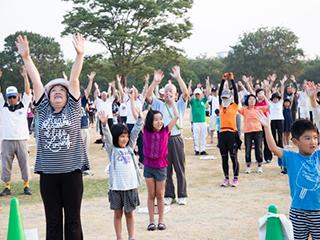会場には小さなお子さまからご高齢の方まで、約2100名の方が集まりました。お盆期間中の開催だったこともあり、帰省中の家族や親戚で参加される方々も多くいらっしゃいました。朝日が顔をのぞかせる中、講師の多胡先生の指導のもと、準備運動、そして本番生放送のラジオ体操を行いました。