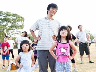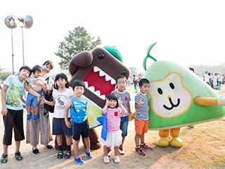 お父さんやお母さんと一緒に嬉しそうにラジオ体操をする子どもたちの笑顔が、会場のあちこちで見られました。ピアノの演奏に合わせて、大人も子どもも思いっきり体を動かしていました。NHKのキャラクター「どーもくん」(大分・カボスバージョンの「どーもくん」)と、大分市高崎山のPRキャラクター「たかもん」も一緒にラジオ体操に参加し、体操会を盛り上げてくれました。