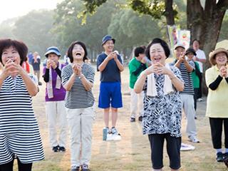 引き続き行われたポイントレッスンにも多くの方が参加され、正しいラジオ体操を学びました。時折ジョークを交えてのレッスンだったので、会場は笑い声で包まれ、楽しく有意義なひと時となりました。終了後には、参加者やスタッフの方々が、多胡先生やピアノ演奏の幅先生、体操会に参加したキャラクターと記念撮影をする姿が見られました。