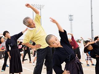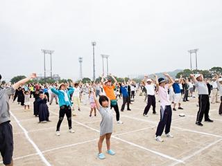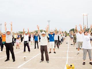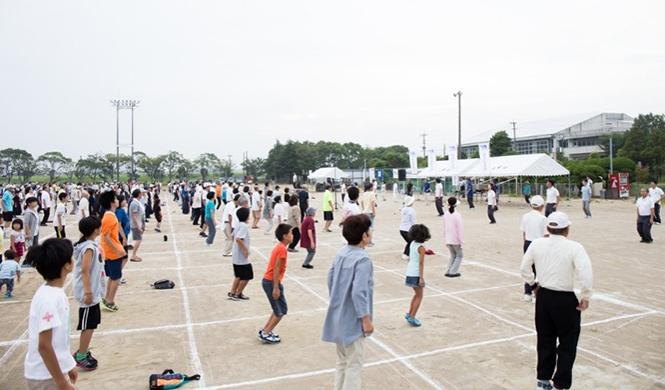 8月16日(火)に福岡県遠賀町の遠賀総合運動公園多目的グラウンドにおいて「夏期巡回ラジオ体操・みんなの体操会」を開催しました。遠賀町は、福岡県北部に位置し、人口はおよそ19000人。昭和39年に「遠賀村」から「遠賀町」となり、一昨年に町制施行50周年を迎えました。主な産業は農業で、特別栽培米の「夢れんげ」や「赤しそドリンク」、「菜種油」など数多くの特産品があります。