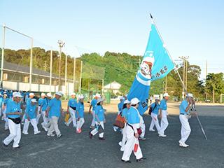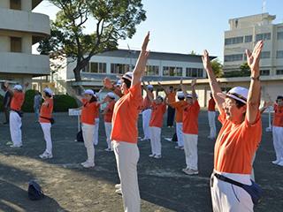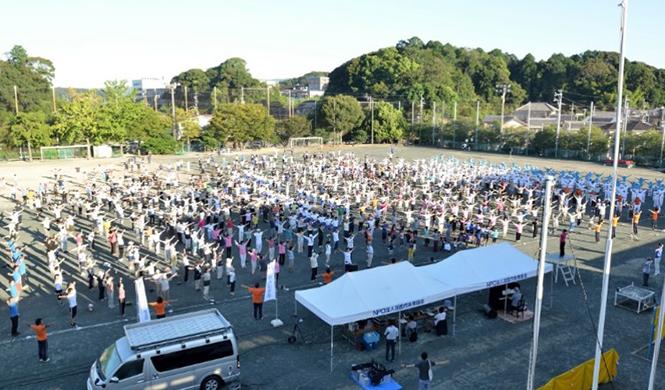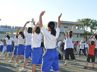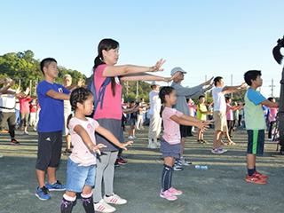 体操服の中学生、それぞれお揃いのユニフォームのラジオ体操連盟のメンバー、近隣の方々が、講師の岡本先生の指導のもと、力強くラジオ体操を行いました。引き続き行われたポイントレッスンにも多くの方が参加し、ラジオ体操の正しい動作など、熱心に学びました。