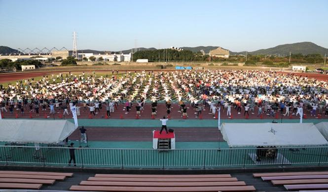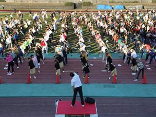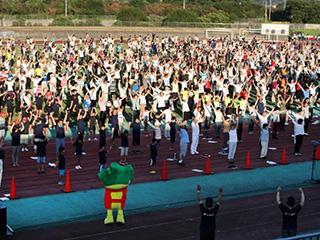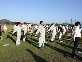 防府市市制80周年記念の体操会会場には、学校のクラブやスポーツチームの小中学生や会社の仲間と出勤前に参加した方など、約2000名が集まりました。陸上競技場の正面スタンド側から朝日が昇り、雲ひとつない青空の下で体操会が始まりました。