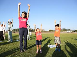講師の多胡先生の指導のもと、準備運動とラジオ体操が行われました。小さなお子さまからご高齢の方まで、様々な年代の参加者が揃って元気に体を動かしました。引き続き行われたポイントレッスンにも多くの方が参加され、ラジオ体操の正しい動作など、熱心に学んでいました。
