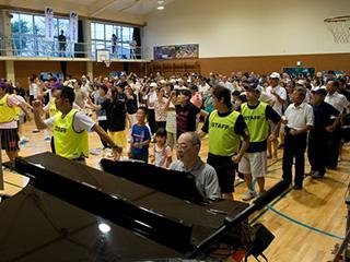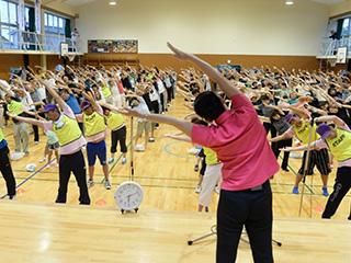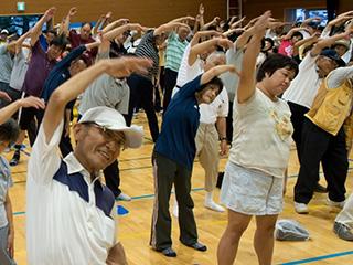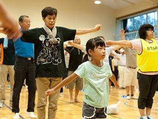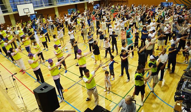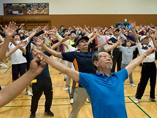 講師の岡本先生の指導のもと、準備運動とラジオ体操が行われました。体育館には活気あふれる歌声や掛け声が響き渡り、小さいお子さまからご高齢の方まで全員が力強く体を動かしました。