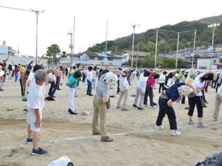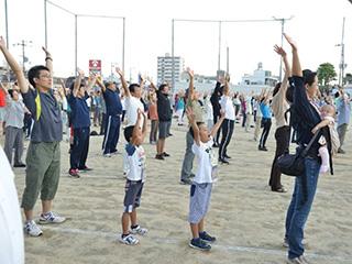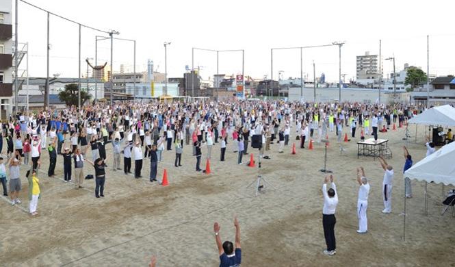 8月31日(水)に大阪府の大東市立四条グラウンドにおいて「夏期巡回ラジオ体操・みんなの体操会」を開催しました。大東市は大阪市の東に位置する人口およそ12万4千人のまちです。市の東部にある飯盛山には、織田信長に先駆けて畿内統一を果たした戦国大名、三好長慶の居城であった飯盛城の城跡があり、ハイキングコースとして親しまれています。
