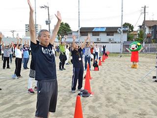 大東市市制施行60周年記念事業スポーツイベントのひとつとして開催された今回の体操会の会場には、小さい子どもからご高齢の方まで、約1000名の参加者が集まりました。来場者を出迎えていた大東市のマスコットキャラクターの「ダイトン」も加わって、元気に準備運動からスタートしました。