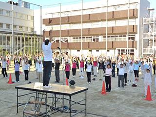 講師の多胡先生の指導のもと、グラウンドいっぱいに並んだ参加者が、幅先生のピアノ演奏に合わせてのびのびとラジオ体操を行いました。引き続き行われたポイントレッスンにも、多くの方が参加されていました。