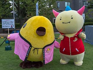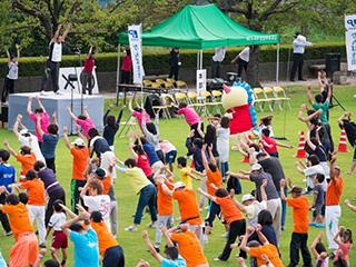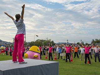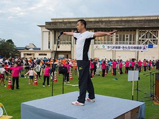 NHKのラジオ体操放送開始に合わせてラジオ体操が始まりました。多胡先生やアシスタントの松下さん、清水さんの動きに注目しながら、のびのびと体を動かしました。「福井しあわせ元気国体2018」のマスコットキャラクター「はぴりゅう」とかんぽ生命の「ゆめぴよ」も体操に参加して、体操会を盛り上げていました。