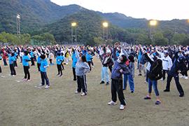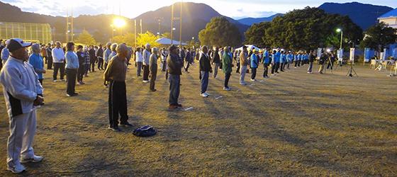 早朝まだ暗く、肌寒い中、子どもから大人まで幅広い年代の方に、遠方、広域からご参加いただきました。 かんぽ生命企業キャラクター「かんぽくん」も記念写真を求められ大人気でした。 ラジオ体操制定90周年の節目の「巡回ラジオ体操・みんなの体操会」でしたが、今年最後の開催を大盛会で終えることができました。