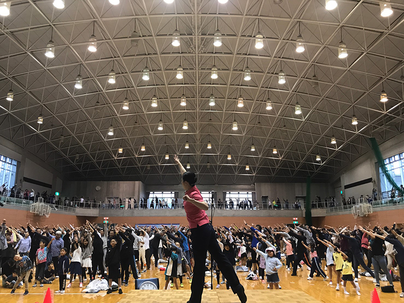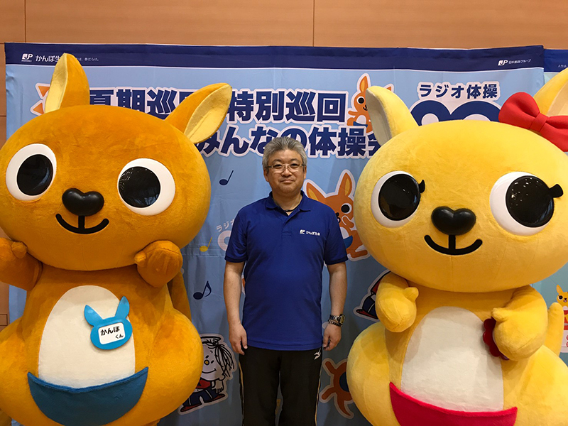 あいにくの天候で雨天会場での開催となりましたが、大郷町の「常のモロ」、かんぽ生命の「かんぽくん」「ゆめちゃん」も参加し、大いに盛り上がった体操会でした。