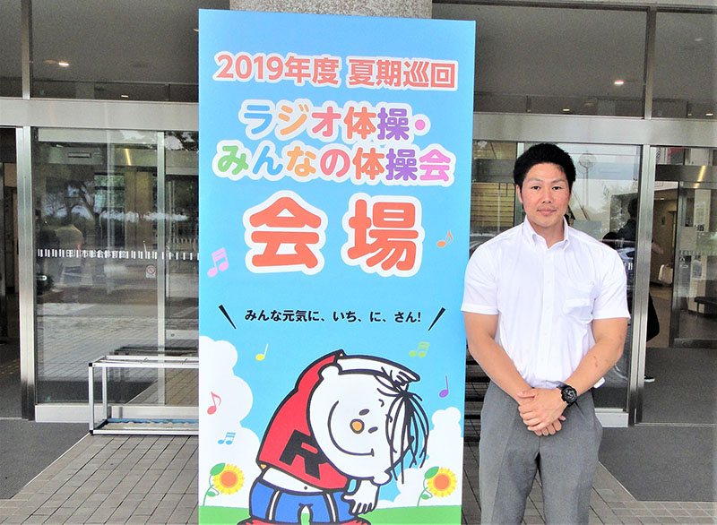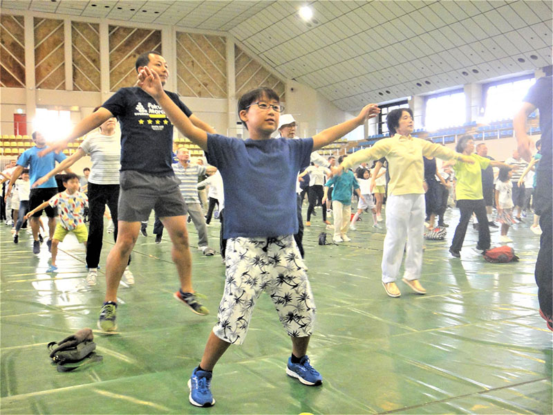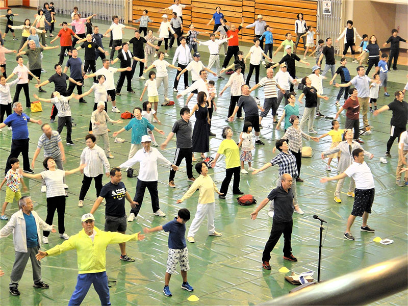 ご当地マスコットキャラクター「たがたん」も登場し、明るいかけ声で元気に始まった体操会。