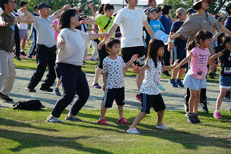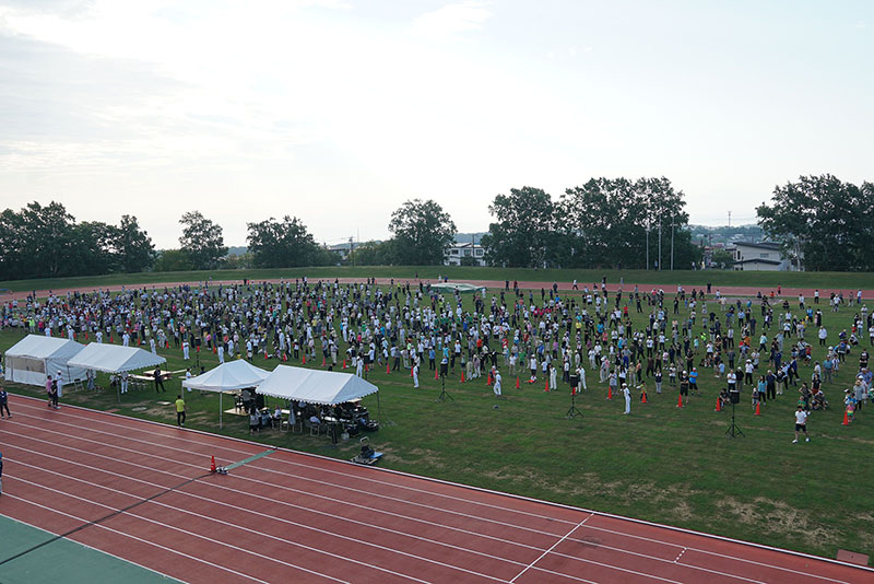 整備されたトラック内の芝生で小さな子供から年配の方まで、多胡先生のよく通る声に合わせて手や足を動かし、笑顔があふれる体操会で盛会に幕を閉じることができました。