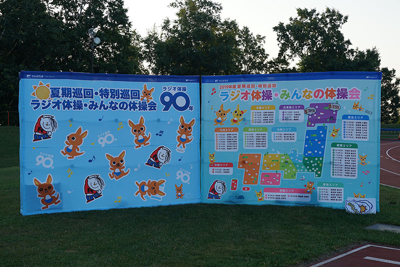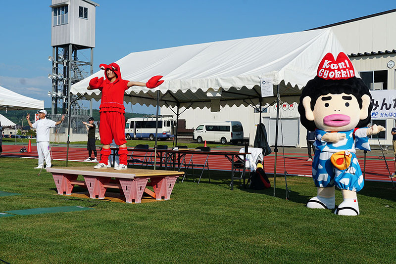 網走市で開催された夏期巡回ラジオ体操会は、ぬけるような青空と真夏の太陽の下約1,700名を上回る方々の参加をいただき、早朝から参加者の皆さまの熱気の中で体操を行いました。