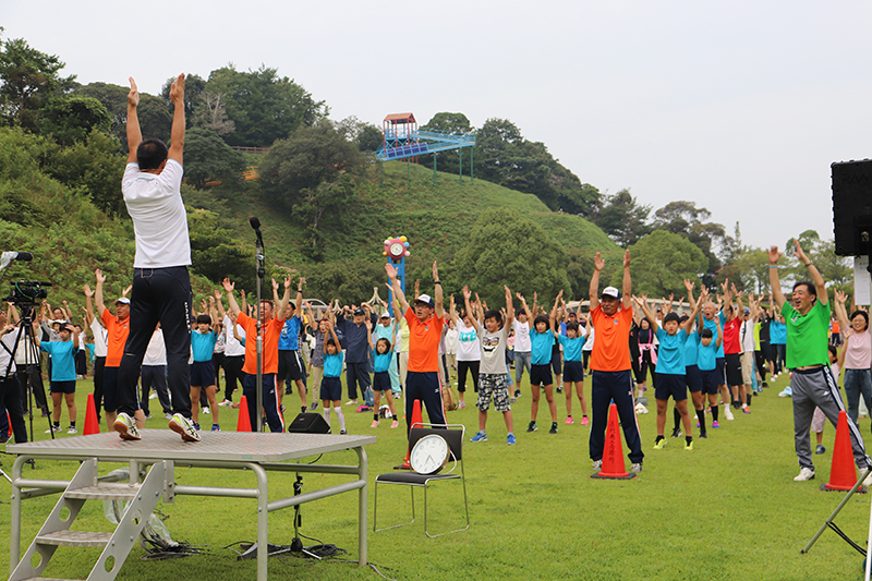 当日は、市長をはじめ参加されたみなさんが緑の芝生の上で元気よく体を動かされ、笑顔あふれる体操会となりました。