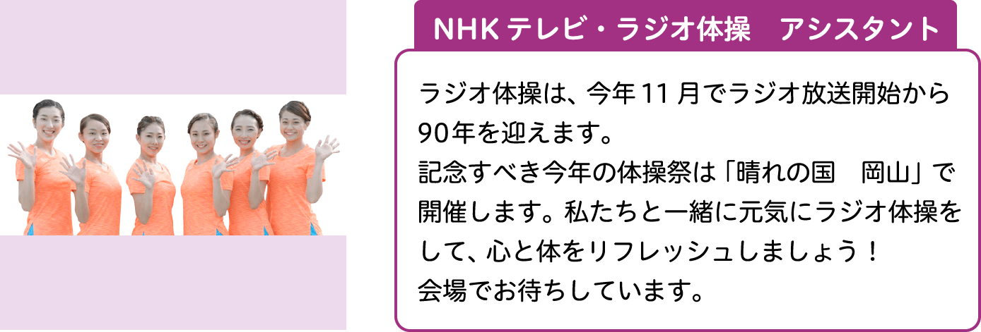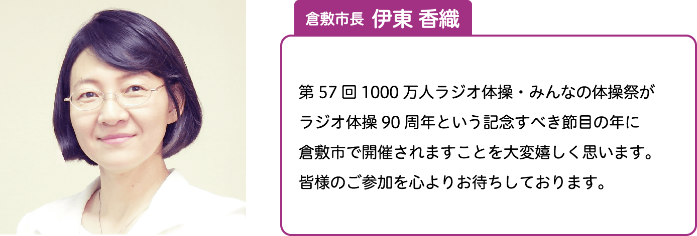 [共催]倉敷市、倉敷市教育委員会、公益財団法人倉敷市スポーツ振興事業団 [後援]岡山県、岡山県教育委員会、公益財団法人岡山県体育協会、一般財団法人倉敷市体育協会、岡山県スポーツ推進委員協議会、倉敷市スポーツ推進委員協議会、倉敷市生涯スポーツ推進協議会、公益社団法人倉敷観光コンベンションビューロー、社会福祉法人倉敷市社会福祉協議会、倉敷市老人クラブ連合会、倉敷市愛育委員会連合会、倉敷市栄養改善協議会、一般財団法人簡易保険加入者協会(順不同)[主管]株式会社かんぽ生命保険岡山支店、NHK岡山放送局、岡山県ラジオ体操連盟 [協力]日本郵政グループ