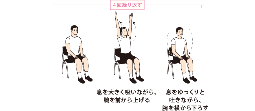 • 腕をよく伸ばして、ゆっくり高く上げ、背すじを伸ばしましょう