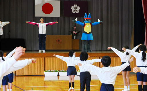 ラジオ体操出張授業は、ラジオ体操を通じて、子どもの健全な育成を支援するため、また、若年層へのラジオ体操の普及促進を図ることを目的に、全国の小学校にNHKテレビ・ラジオ体操指導者およびアシスタントを招き、実施しています。