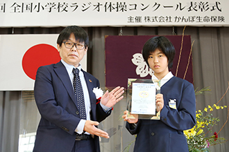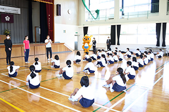 表彰式の後「ファイヤーファイブ」がラジオ体操を披露しました。その後,全校生徒が集合しての出張授業が行われました。多胡先生の指導と細貝先生のピアノで、正しいラジオ体操を教わりました。授業にはアシスタントの戸塚さん、かんぽ生命の企業キャラクター「かんぽくん」も参加して、最後にみんなでラジオ体操第一を行いました。