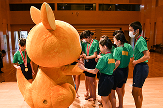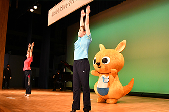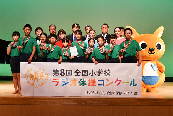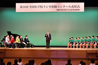 表彰式の後「八代目美土里グリンピース」がラジオ体操を披露しました。その後、全校生徒が集合しての出張授業が行われました。岡本先生の指導と幅先生のピアノで、楽しくラジオ体操を教わりました。授業にはアシスタントの舘野さん、かんぽ生命の企業キャラクター「かんぽくん」も参加して、最後にみんなでラジオ体操第一を行いました。
