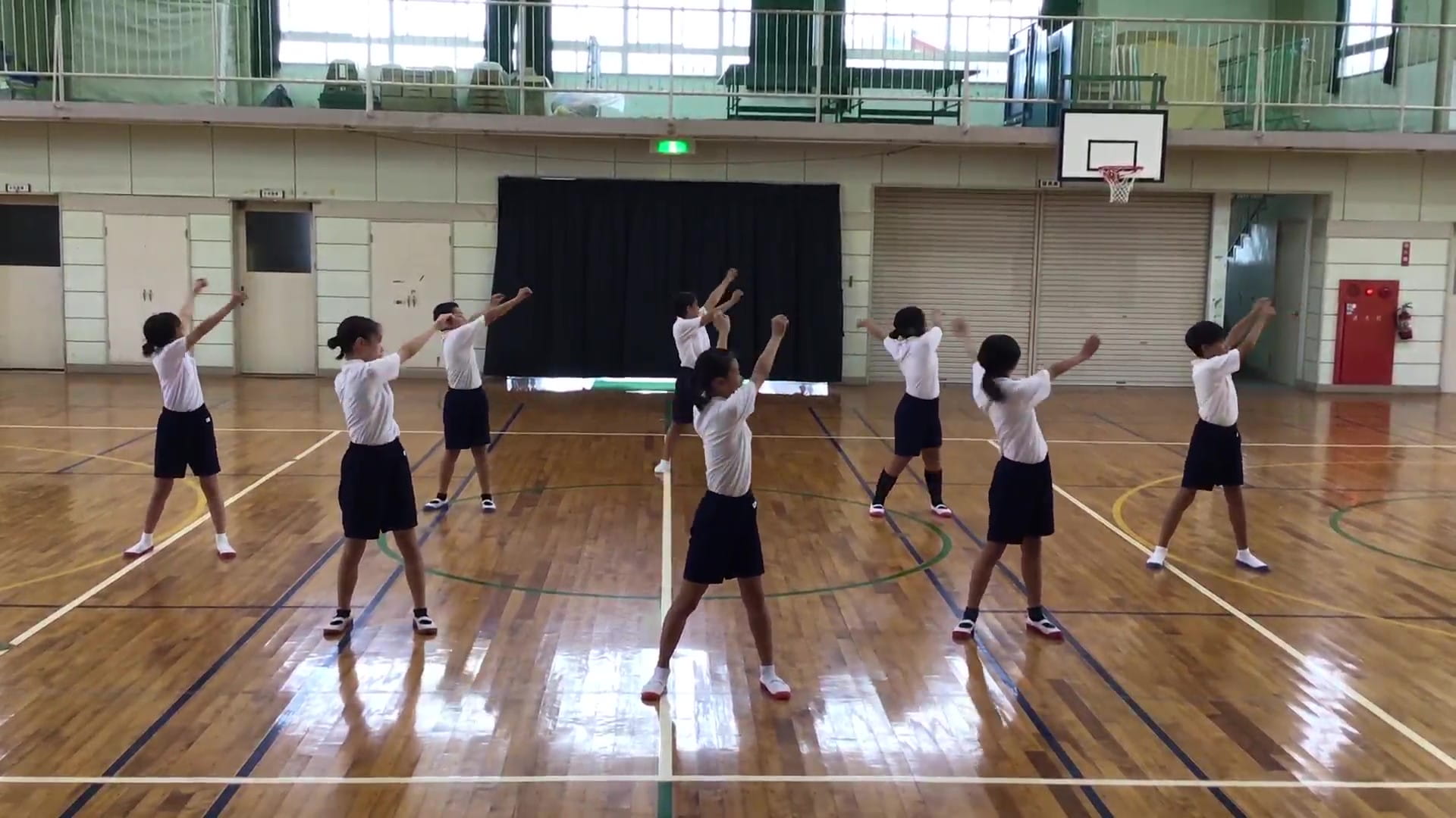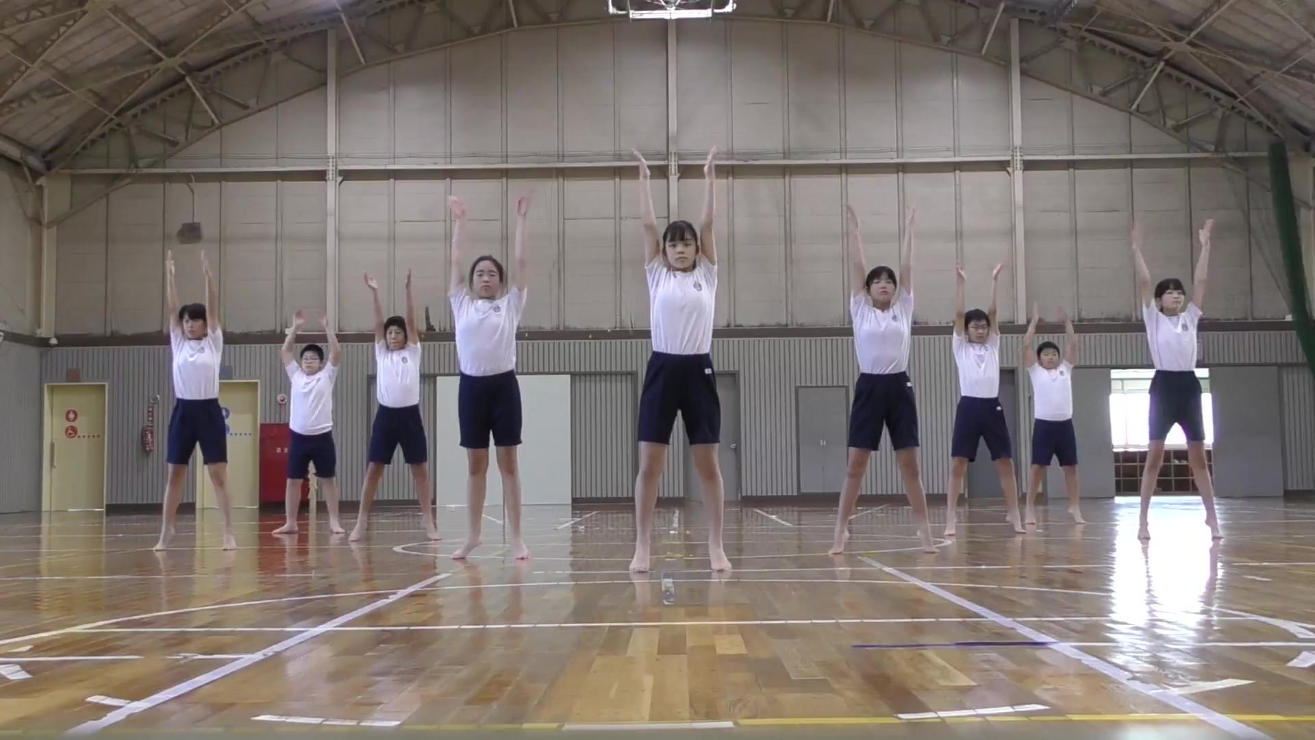 6年生9人でダイナミックに大きく動けており、元気の良さが印象的で、とても良かったです。体操の中では、特に横まげの運動が素晴らしかったです。おめでとうございます(審査員)。