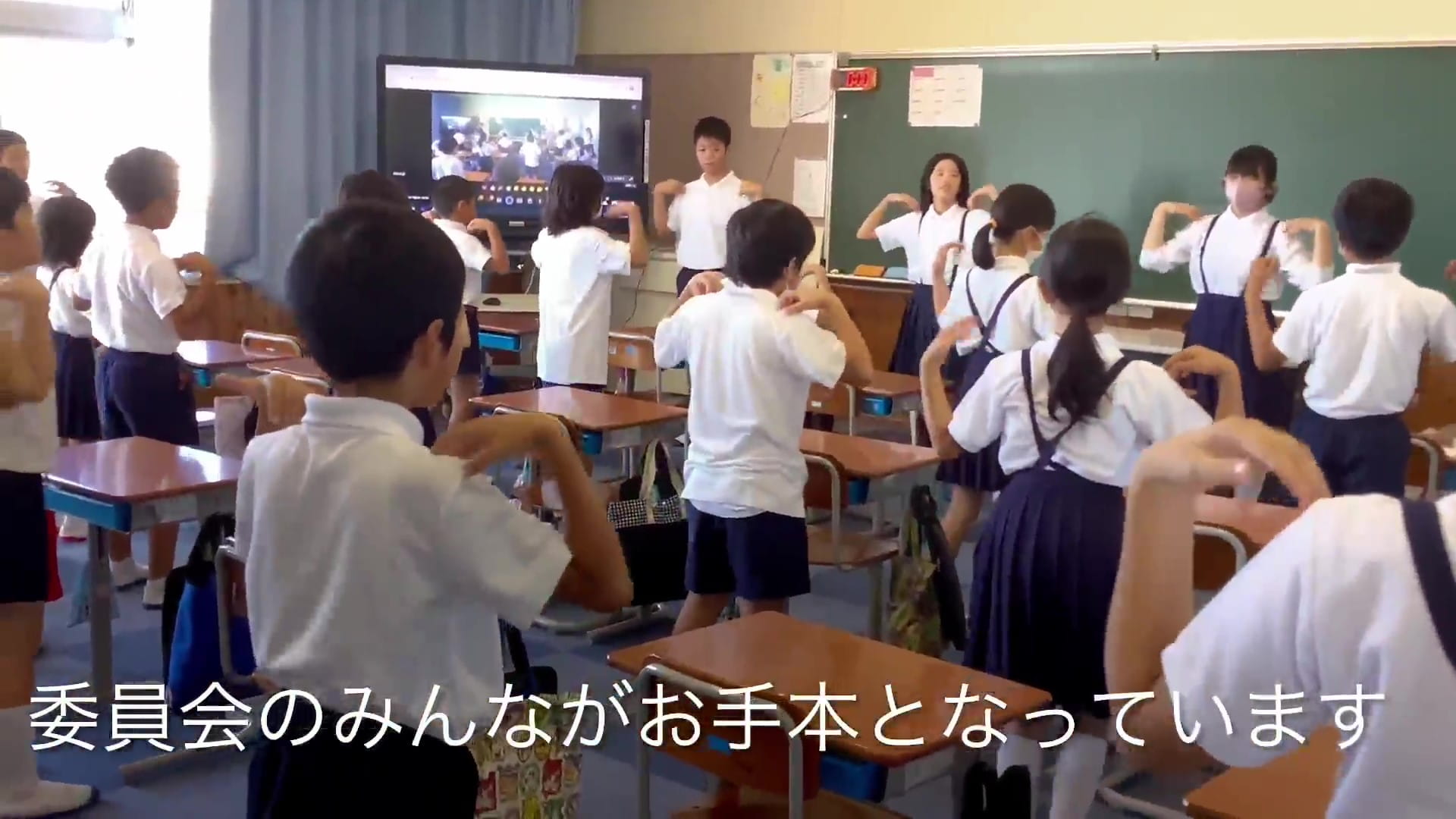 生徒がお手本を見せ、その動きをタブレットでリモート中継している点が新しい取り組みであり、学校としての一体感も伝わってきました。6年生が1年生の教室に足を運んで一緒にラジオ体操をしている姿や、生徒が先生に教える様子も見られ、児童みんなの笑顔が校舎いっぱいにあふれていることが想像でき、微笑ましく感じました。学校・地区合同運動会の開会式で地域の皆さんと一緒に楽しくラジオ体操をされることを期待しております(審査員)。