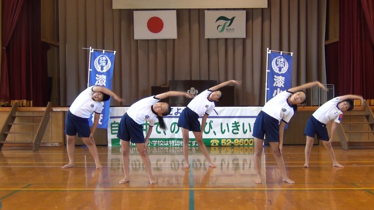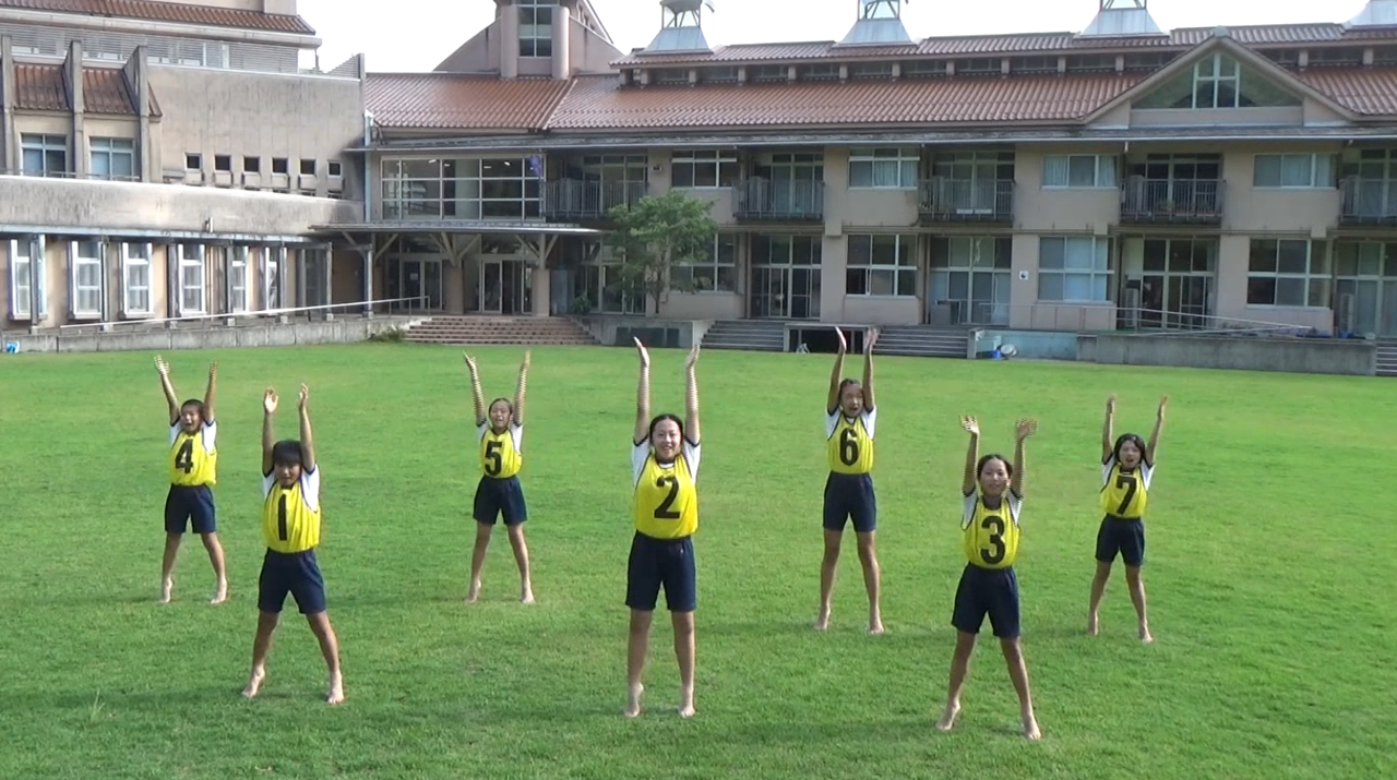 運動の意味をしっかりと理解しながら体操していることがわかりました。特に、3番の腕を回す運動、4番の胸を反らす運動、5番の横曲げの運動は特に動きが大きくできており、素晴らしかったです。また、皆さんの動きが綺麗に揃っていて、たくさん練習をして仕上げてきたことが動画を通して伝わりました。銀賞受賞おめでとうございます。(審査員)