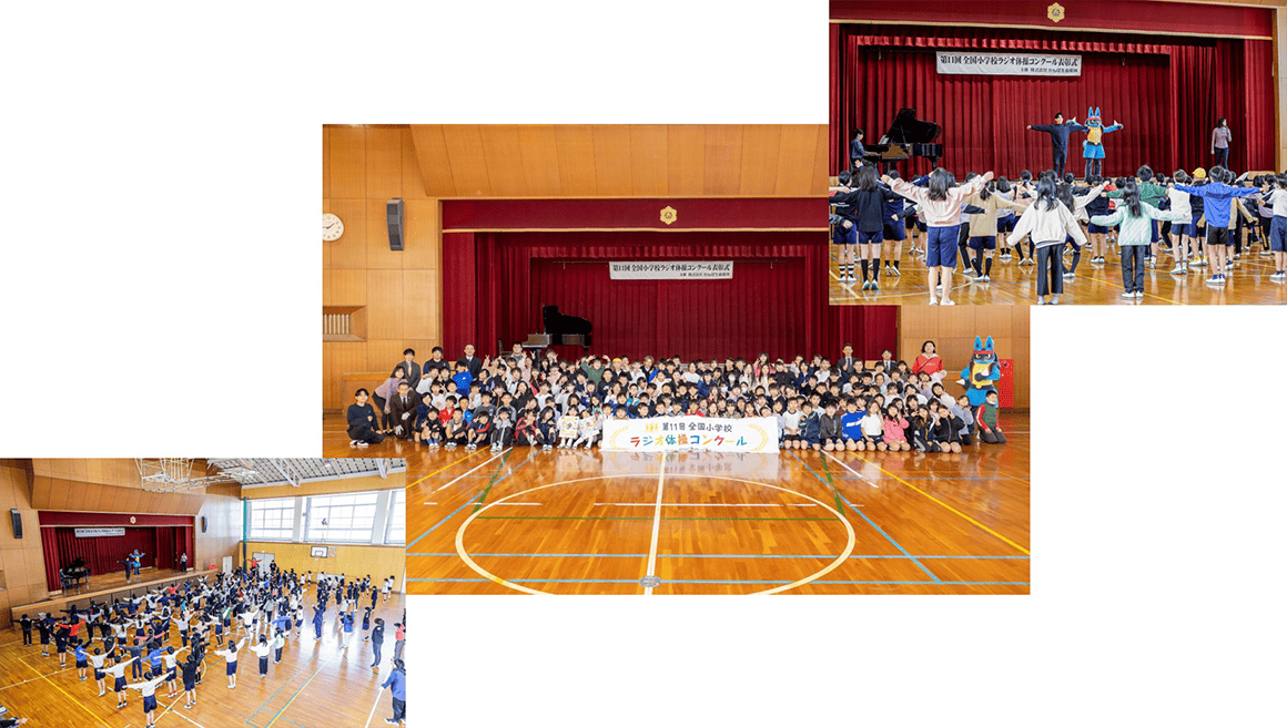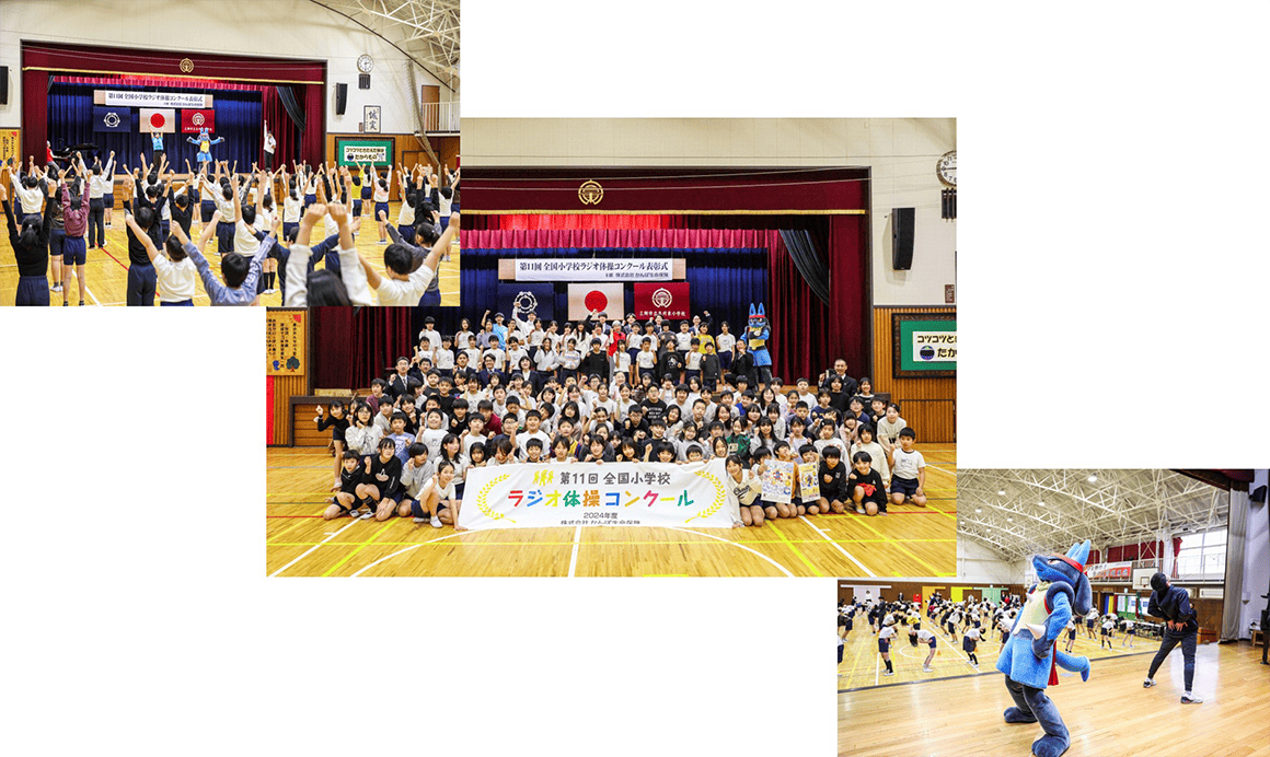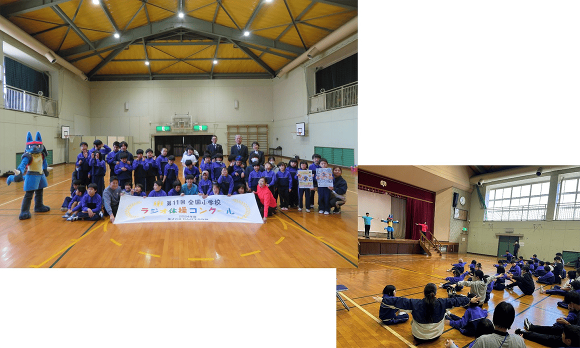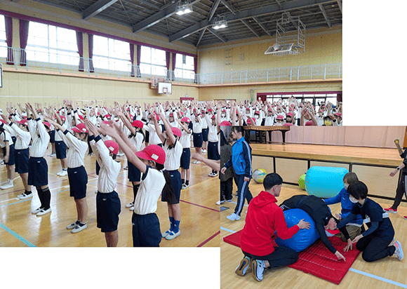 ラジオ体操コンクールに応募していただいた約400チームの中から技術部門金賞・銀賞・銅賞の3校および抽せんで選ばれた10校で出張授業を実施しました。