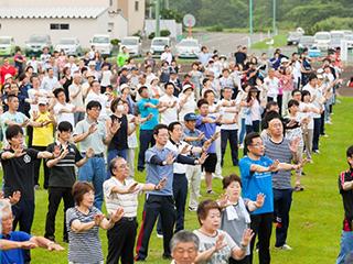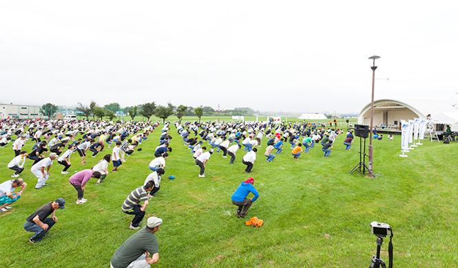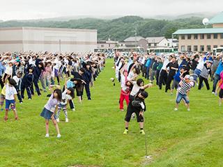 共和町に開拓の鍬が下ろされてから今年で160年を迎え、今回の体操会は、「かかしの古里共和町160年記念」として開催されました。体操会には、早朝から大勢の方が集まり、参加者は約1200名となりました。