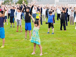 講師の多胡先生の指導による準備運動が行われた後、ラジオ体操が始まりました。大人から子どもまで、力強く体を動かしました。広々とした芝生の上で、のびのびとラジオ体操を行いました。