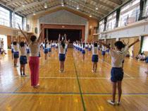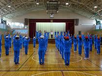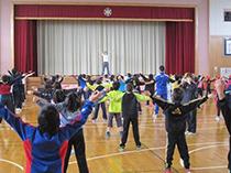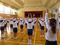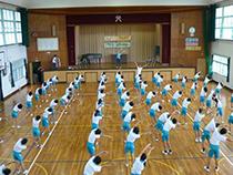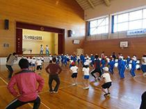 青森県平内町の小湊小学校にて、ラジオ体操出張授業を行いました。当日は、6年生54名が参加し、体操講師の多胡先生とアシスタントの清水さんから、正しいラジオ体操の指導を受けました。