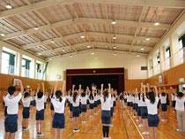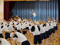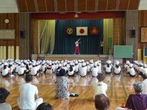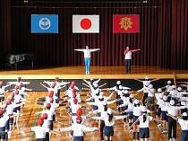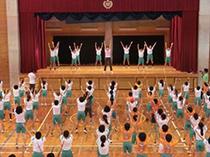 沖縄県那覇市の那覇小学校にて、ラジオ体操出張授業を行いました。当日は、5年生と6年生の児童合わせて150人が参加し、体操講師の多胡先生とアシスタントの松下さんから、ラジオ体操第一の指導を受けました。