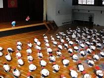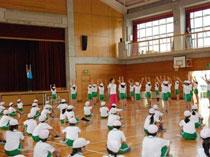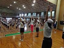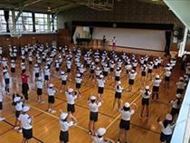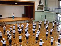 山口県山口市の大内小学校でラジオ体操出張授業を行いました。4年生から6年生の3学年の児童合わせて340人が参加して、講師の西川先生とアシスタントの稲垣さんから、ラジオ体操第1について指導を受けました。