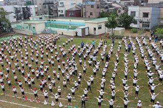 荒川区立瑞光小学校でラジオ体操出張授業を開催しました。全校児童494人が参加し、さわやかな青空の下、とても盛り上がった出張授業となりました。