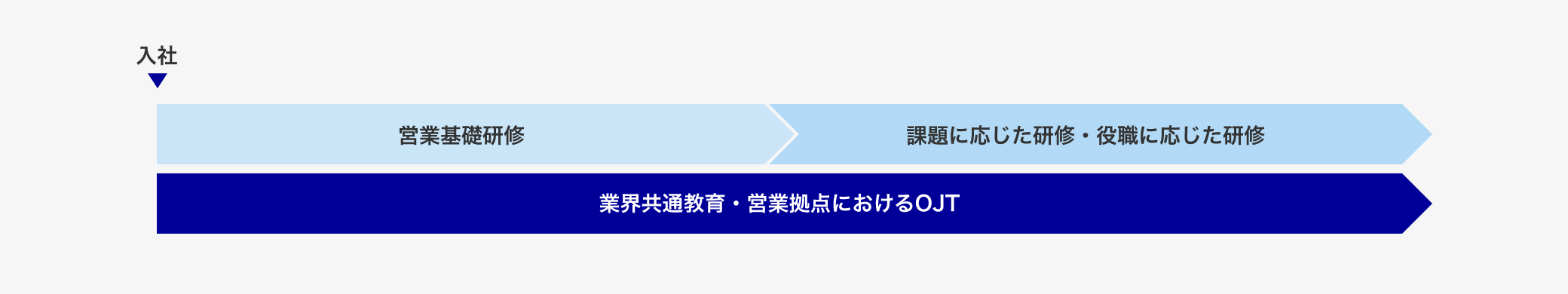 集合研修・業界共通教育などを通じて、個人・法人マーケットでの保険募集に必要な基礎的な知識とスキルを習得し、更に質の高いコンサルティングセールスが実践できる人材の育成を目指し、個々の課題に応じた教育を営業拠点におけるOJTを中心に実施しています。
