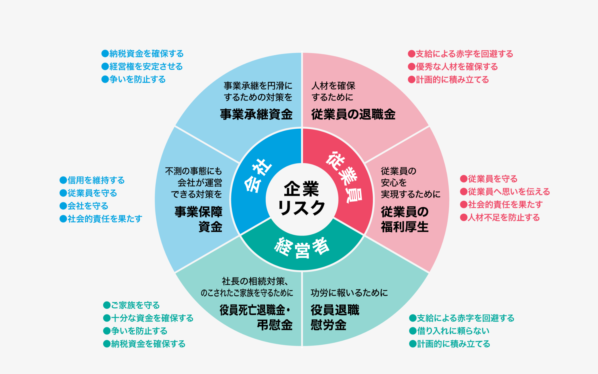 具体的には、企業の経営者さまが抱える様々なニーズ【従業員の福利厚生(万が一の保障・病気・ケガへの対応)/事業保障対策/退職金準備等】にお応えするため、生命保険の活用のご提案を行います。