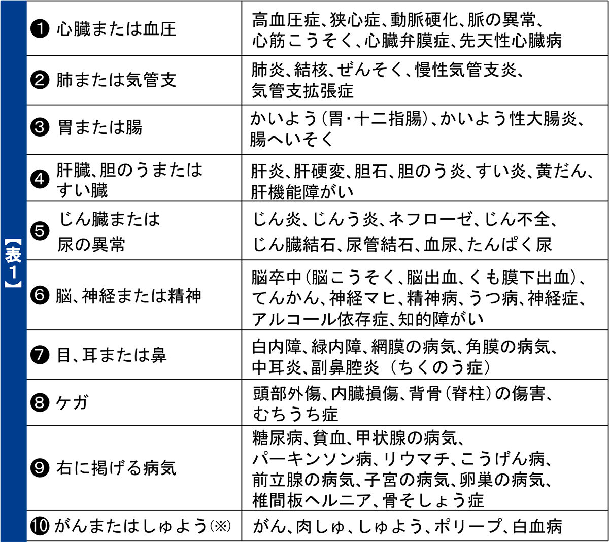 1 契約後(契約日から1年経過後は過去1年以内)に、【表1】の病気またはケガにより、医師の診察、検査、治療、投薬を受けたことがありますか。 なお、病気またはケガが治ゆ(完治)している場合や、医師の検査の結果が異常なしの場合も「はい」に該当します。 ※ 過去にがんまたは肉しゅにかかったことがあり、契約後(契約日から1年経過後は過去1年以内)においてその予後(治療後の経過)をみるため、定期的な診察または検査を受けた、すすめられた、予定されている場合は「はい」に該当します。