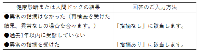 3 ❶、❷で回答した内容以外で、契約後(契約日から1年経過後は過去1年以内)に受けた健康診断または人間ドックで【表2】の臓器の異常や検査結果の異常(「要再検査」、「要精密検査」、「要治療」を含む)を指摘されたことがありますか。 ※ 再検査を受けた結果、異常なしとされた場合は「指摘なし」に該当します。 なお、契約後(契約日から1年経過後は過去1年以内)に健康診断または人間ドックを受けたことがない場合も「指摘なし」に該当します。